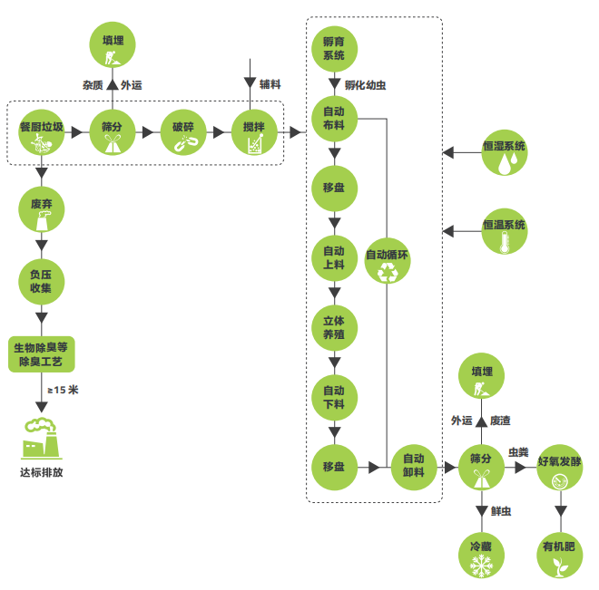 智能收運(yùn) + 預(yù)處理 + 昆蟲(chóng)處理技術(shù) + 有機(jī)產(chǎn)品加工 + 臭氣處理